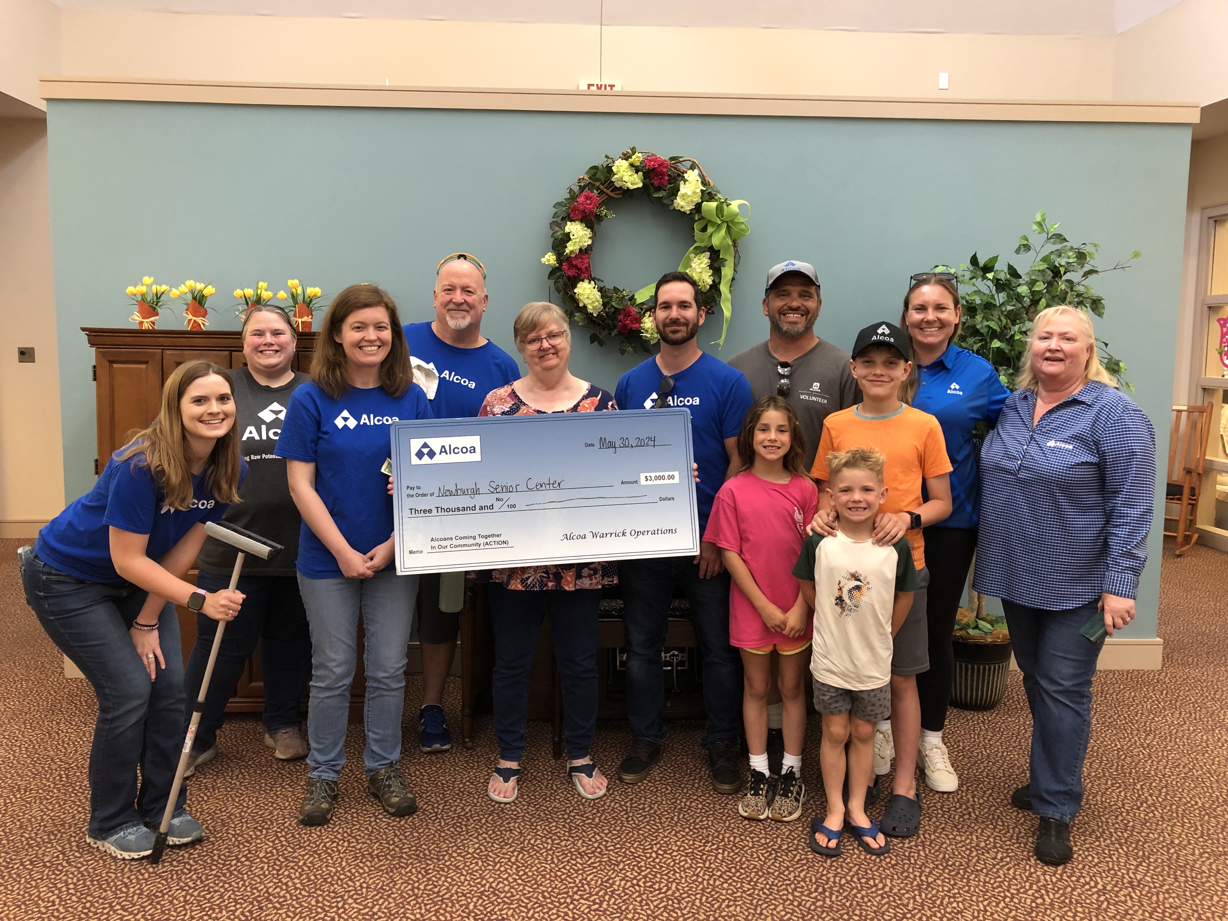Thank you, Alcoa Warrick Operations, for choosing the Newburgh Senior Center to receive an Alcoa ACTION (Alcoans Coming Together in Our Neighborhood) Grant on May 30, 2024. It was great having Alcoa volunteers sponsor a BINGO, wash our windows, clean up our landscaping, and shampoo the carpeting. Having a “sparkling” Center is wonderful. We truly enjoyed meeting the Alcoa volunteers and family members and getting acquainted. The grant will be used in support of programs at the Center.